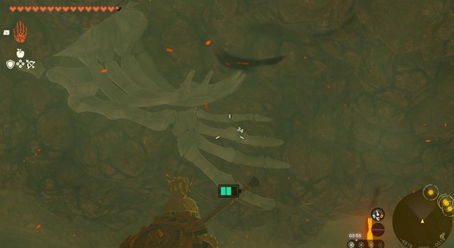 Le corps du bébé se trouve au-dessus de celui de la mère, enfermé dans des rochers. Pour l’atteindre, vous devez tirer des flèches avec des bombes sur l’amas rocheux au plafond afin de libérer le corps. Il y a des Fleurs-bombes tout autour de la grotte pour vous aider. Il nous a fallu quelques tirs pour faire tomber le corps. Il ne vous restera plus qu’à assembler la tête du fossile avec son corps puis sa queue.