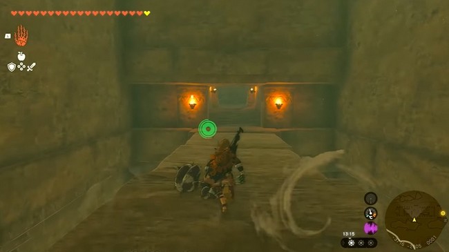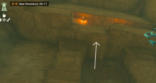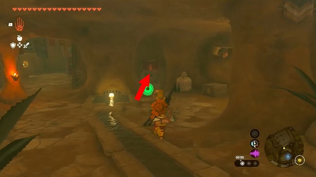 Vous découvrirez un autre long chemin dans la grotte qui mène à une porte qui ne peut pas encore être ouverte. Continuez à suivre le chemin jusqu’à ce que vous tombez sur un Gibdo. Utilisez des armes élémentaires ou des flèches pour éliminer le Gibdo, puis passez par un autre trou dans la chambre juste derrière lui. La chambre semble d’abord vide, mais regardez vers le haut pour trouver un passage que vous pouvez emprunter. Utilisez Infiltration pour atteindre la porte.