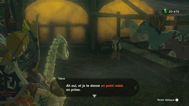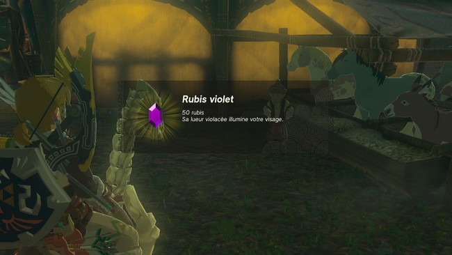 Une fois le cheval amené à Tabos, celui-ci offrira à Link 1 rubis violet (50 rubis) et 1 point relais.