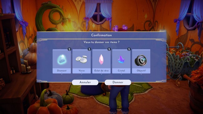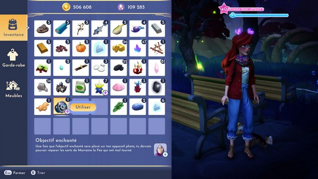 Une fois que vous avez les matériaux, retournez voir Marraine la Fée qui vous demandera d’utiliser l’objectif enchanté.