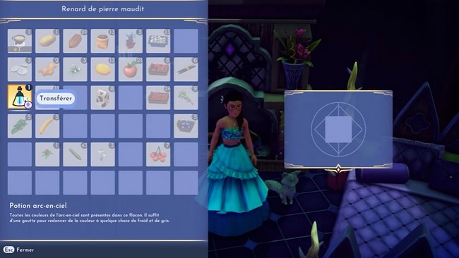 Interagissez avec la statue de renard pour accéder à l’écran d’inventaire. Transférez la potion arc-en-ciel dans la case pour transformer la statue en compagnon renard arc-en-ciel ! Pour l’équiper, allez dans votre garde-robe et trouve-le dans la rubrique Compagnons !