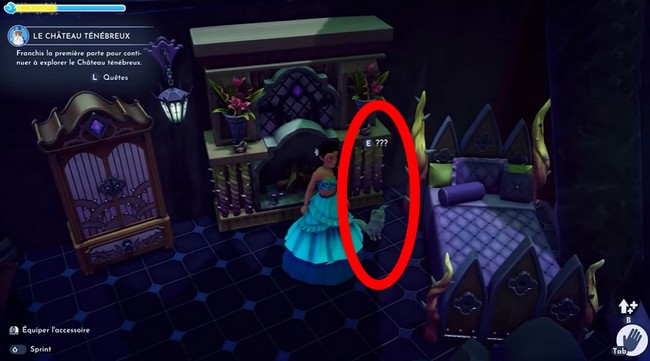 Une fois que vous avez mis la main sur la potion arc-en-ciel, progressez dans la ligne de quête des reliques oubliées jusqu’à ce que vous entriez dans le château des ténèbres. Ici, vous apparaissez au rez-de-chaussée d’un château. Cependant, avant de franchir la première porte, dirigez-vous vers la droite et éliminez les épines. En passant devant l’escalier, vous trouverez divers meubles, dont le renard de pierre assis sur le sol.