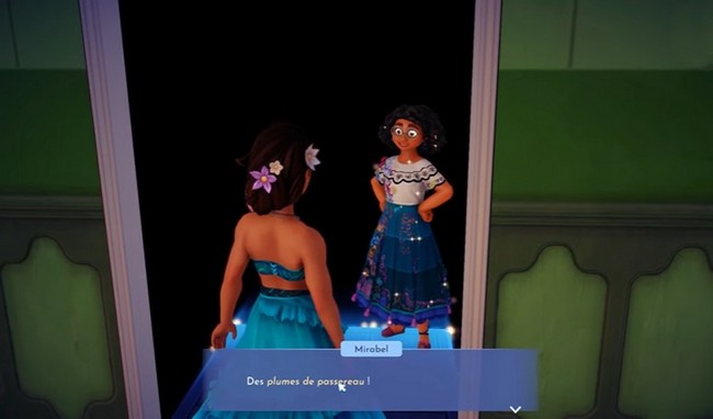 En ce qui concerne Mirabel, elle veut des plumes de passereau, tissu et des émeraudes.