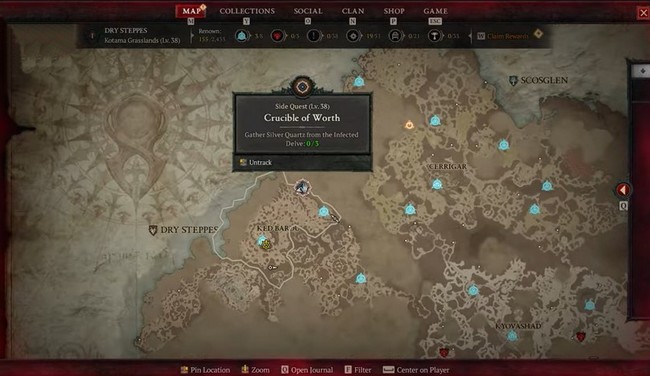 Et maintenant, vous avez les emplacements où vous pouvez trouver des quartz argentés  afin de terminer la quête annexe Le creuset du mérite de Diablo 4. Une fois que vous en aurez collecté trois, vous pourrez rejoindre Ked Bardu. Parlez à Gerti pour terminer la mission.