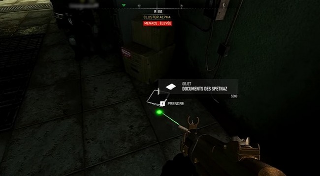Ici, si vous regardez autour de vous et sur le sol, vous trouverez les documents sur les Spetnaz à côté de cartons. Ramassez-les et mettez-les dans votre sac à dos pour les extraire. Vous devez maintenant vous déployer à Vondel pour continuer la mission.