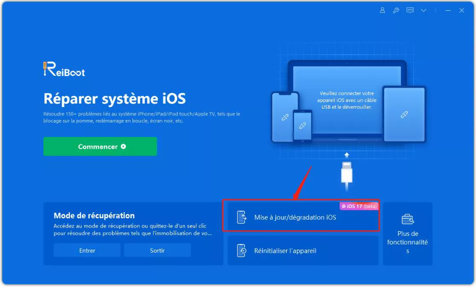 Pour installer et télécharger iOS 17 beta sur votre iPhone en un seul clic à l’aide de Tenorshare ReiBoot, suivez les étapes suivantes :