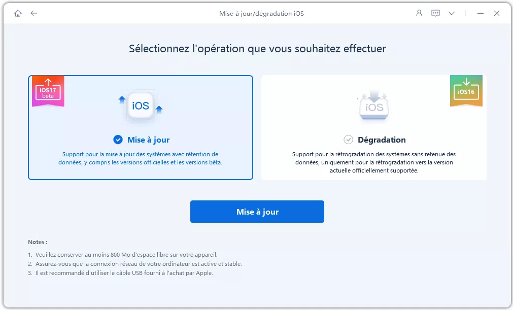 1. Lancez ReiBoot sur votre ordinateur et connectez l’iPhone à l’ordinateur. Une fois l’appareil connecté, cliquez sur « Mise à jour / Rétrogradation d’iOS».