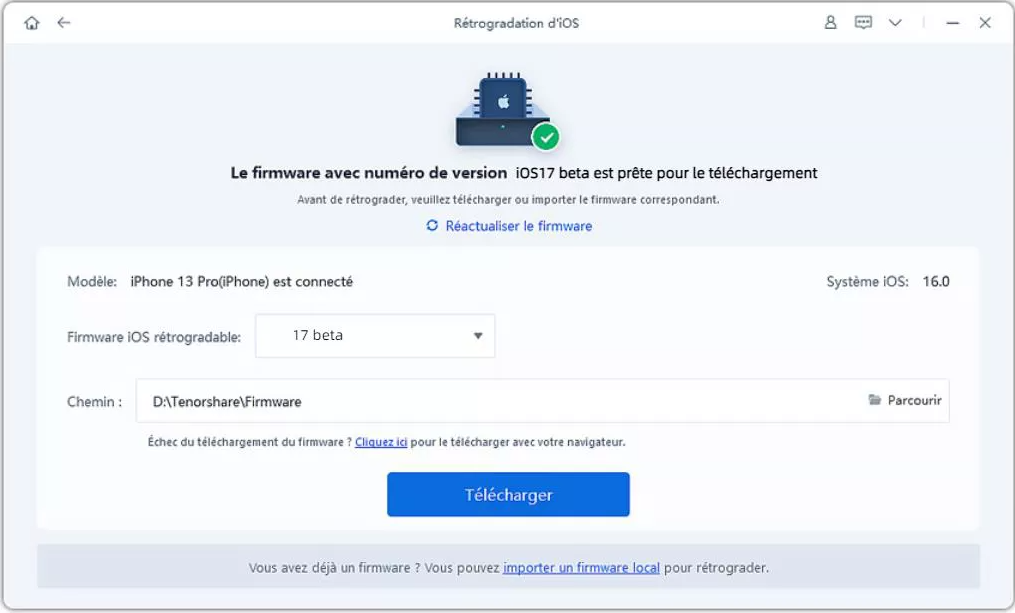 3. ReiBoot détectera automatiquement la version de votre iOS et affichera le firmware iOS dégradable. Cliquez sur « Télécharger » pour obtenir le paquet.