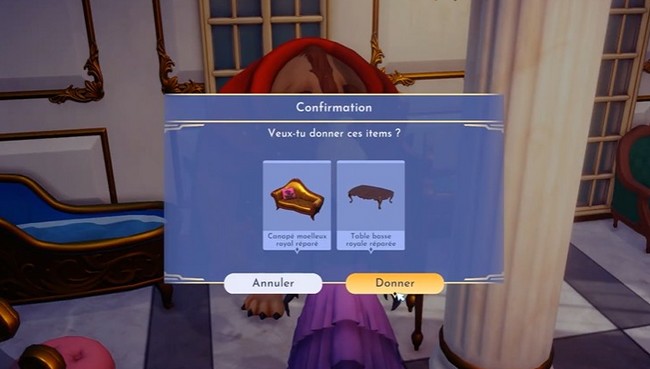 Après avoir réparé les deux meubles, retournez voir la Bête dans son château pour lui donner les objets.