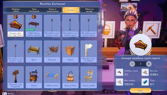 Pour fabriquer Canapé moelleux royal réparé, rendez-vous à n’importe quelle station d’artisanat. Lorsque vous commencez à utiliser une station, un menu géant de recettes d’artisanat s’affiche. Cliquez sur l’onglet Meubles et sélectionnez le « Canapé moelleux royal réparé ». Regardez l’image ci-dessous pour voir à quoi ressemble le meuble.