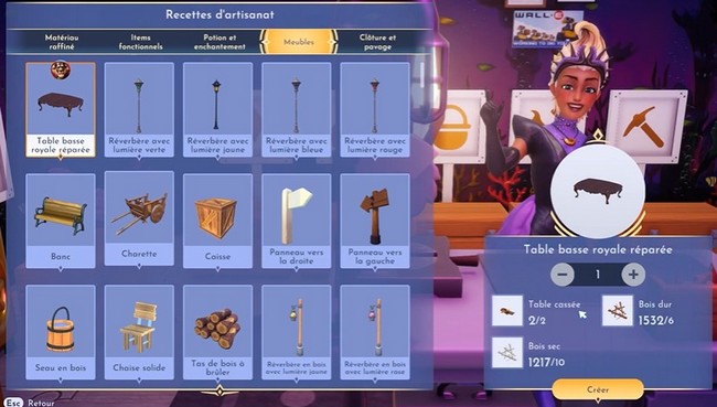 Pour fabriquer la Table basse royale réparée, utilisez à nouveau la station d’artisanat et cliquez sur l’onglet Meubles. Sélectionnez ensuite la Table basse royale réparée. Consultez l’image ci-dessous pour voir à quoi ressemble ce meuble.
