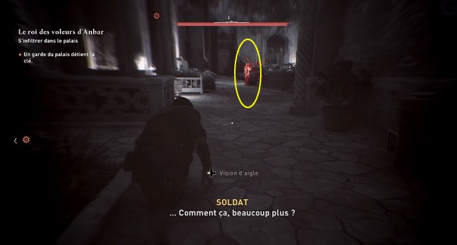 Appuyez simplement sur « V » pour scanner les environs avec la Vision d’aigle. La vision d’aigle révèle un garde en patrouille qui détient la clé que vous cherchez. Le timing est essentiel pour approcher le garde discrètement. Utilisez votre environnement à votre avantage, en vous cachant et en choisissant entre le vol à la tire ou l’assassinat furtif pour obtenir la clé en silence. Une fois la clé en votre possession, vous êtes prêt à passer à l’action.