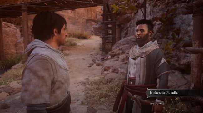 Une fois que vous avez bien atterri, sortez de la meule de foin et suivez Roshan. Elle vous reprochera de ne pas avoir surmonté votre peur et vous montrera un assassin en train d’effectuer un saut de la foi parfait du haut des falaises, avant de vous emmener au campement. Celui-ci s’ouvrira sur une zone d’exploration, vous permettant de traverser le camp et de parler aux PNJ optionnels afin de déchiffrer l’emplacement d’un homme nommé Fuladh.
