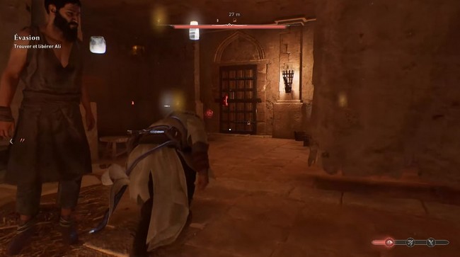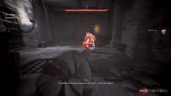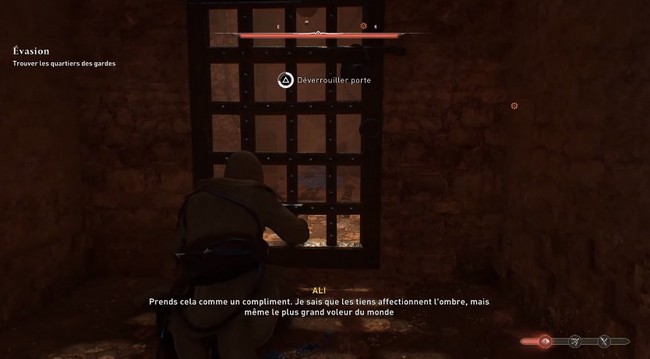 Traversez les tunnels sombres jusqu’au bout (il y a beaucoup de cellules de part et d’autre du chemin principal, mais vous ne pourrez pas les explorer). Dans la pièce au bout du chemin, vous verrez le geôlier et Ali.