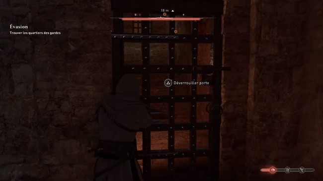 La porte menant plus loin dans la prison mène à une petite pièce ouverte où quelques prisonniers traînent et discutent. Plusieurs gardes patrouillent sur le côté droit et le long du mur opposé au point d’entrée. Utilisez la vision d’aigle pour les surveiller. Lorsque vous pouvez le faire en toute sécurité, allez vers les prisonniers et mêlez-vous à eux.
