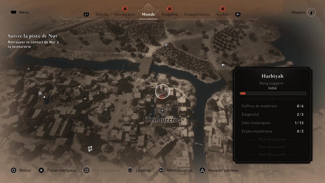 Si vous regardez votre carte, vous verrez qu’il y a un marqueur d’objectif au nord indiquant l’emplacement général de la teinturerie et du contact de Nur. Rendez-vous à cet endroit et utilisez Enkidou pour localiser l’emplacement exact du contact.