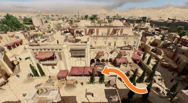 Une fois sur place, contournez le Siège de la chourta par le côté sud. Le trésor se trouve dans la cour, juste après la porte et, malgré le dessin, il n’y a pas de gardes dans les parages.