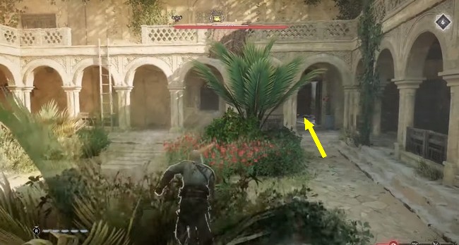 La tenue ou bien l’amélioration sera située près du côté du bâtiment qui fait face à l’eau. Donc, si vous venez d’une autre direction que l’eau, dirigez-vous vers cet endroit. Ensuite, cherchez une porte. Pour vous aider à l’identifier, il y aura deux ou trois gardes près des escaliers menant au coffre. Vous pouvez soit vous faufiler derrière eux, soit vous débarrasser des gardes, c’est à vous de choisir.