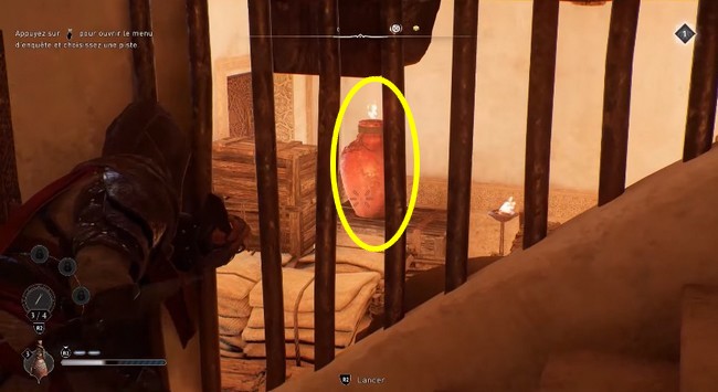Une fois à l’intérieur, descendez les escaliers et utilisez votre couteau de lancer pour briser la jarre de feu. Cela la fera exploser et déverrouillera la porte principale en bas.