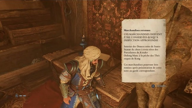 Il vous indique ensuite où se trouve l’entrepôt des saisies du capitaine de port. C’est là que vous trouverez les objets confisqués dont parle Kong. En échange de son aide, Kong fera de son mieux pour que Basim participe à la Grande vente aux enchères.