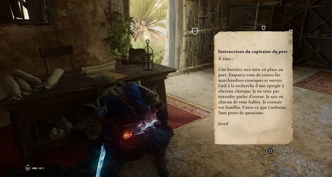 Bien que la zone soit vaste, le meilleur moyen de savoir si vous êtes proche d’un objectif de quête est d’écouter les gardes. Ceux qui se parlent à eux-mêmes ont généralement les objets dont Basim a besoin pour en savoir plus sur le capitaine du port. Ces objets sont des morceaux de papier sur le bureau que vous pouvez examiner après avoir éliminé le garde.