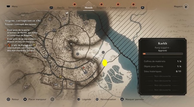 Pour trouver l’entrepôt des saisies dans Assassin’s Creed Mirage, vous devez vous rendre à l’est de Karkh. Cela fait partie de la quête principale « Argent, corruption et thé », où vous devrez accéder à l’entrepôt afin d’assassiner le capitaine du port. Il y a deux façons de trouver l’entrepôt sur votre carte.