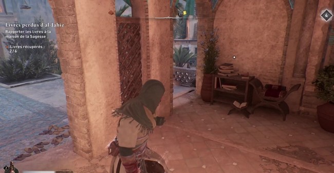 Lorsque vous pensez l’avoir trouvé, utilisez votre Vision d’aigle pour mettre en évidence le parchemin de l’énigme. Il se trouve en haut d’une étagère.