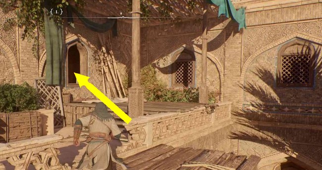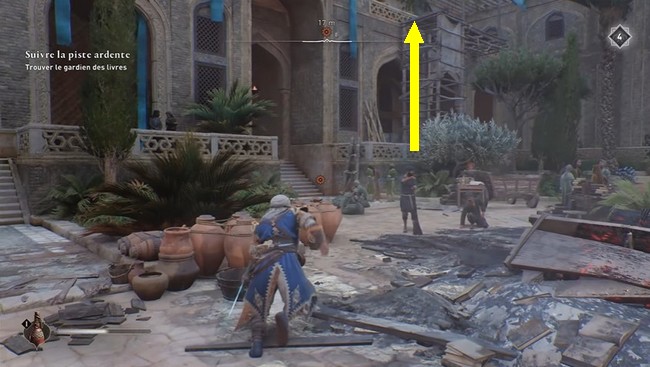 Lorsque vous arrivez à la Maison de la Sagesse, dans le coin le plus à l’ouest du quartier d’Abbasiyah, il y aura un marqueur de quête orange dans la cour. Allez-y pour entendre des érudits parler et Basim dire qu’il doit aller voir au deuxième étage. Grimpez sur l’échafaudage en bois jusqu’au deuxième étage, à côté du marqueur de quête.