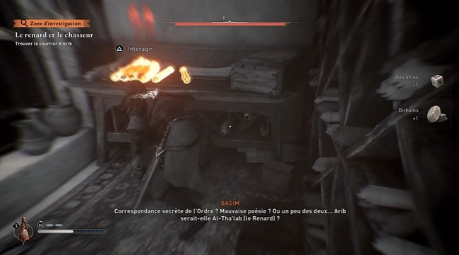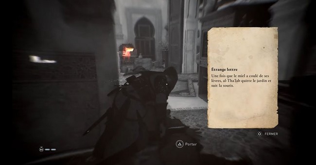 Eliminez furtivement les gardes tout en cherchant l’étrange lettre. Vous la trouverez au rez-de-chaussée du bâtiment en utilisant votre vision d’aigle. La lettre dit : « Une fois que le miel a coulé de ses lèvres, Al-Thal’lab quitte le jardin et suit la souris. »