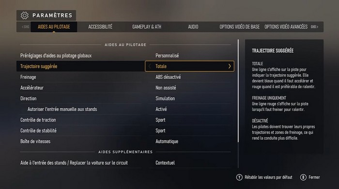 Le réglage de la trajectoire suggérée permet de contrôler le niveau de guidage sur la piste. Si vous le réglez sur Totale, il y aura toujours une ligne sur la piste devant vous qui vous indiquera quand appuyer sur l’accélérateur, freiner ou simplement laisser la voiture rouler en roue libre. Si vous le réglez sur Freinage uniquement, la ligne n’apparaîtra que lorsque le jeu vous suggérera d’accélérer ou de freiner, mais elle vous laissera le soin d’appuyer sur l’accélérateur et de vous positionner sur la piste.