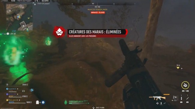 Vous recevrez alors un message indiquant « Menace détectée » et les créatures des marais sont apparues autour de vous. Vous devrez tuer tous les créatures des marais, en gardant à l’esprit que ces entités courent assez vite et peuvent prendre beaucoup de coups.