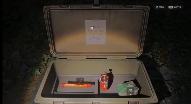 Saisissez ce code dans la caisse et vous trouverez trois objets à l’intérieur. Il s’agit d’une fusée éclairante, une trousse de secours et un réservoir de gaz propane. Les deux premiers sont utiles pour l’offensive et la guérison, tandis que le réservoir de propane sera utile plus tard.