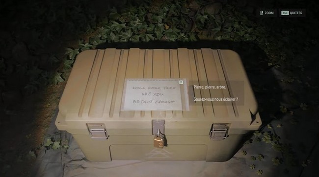 La serrure à combinaison Rock Rock Tree apparaît pendant le chapitre Return 2 : Cœur d’Alan Wake 2. En explorant la zone bord de l’eau, vous tomberez sur une caisse sur laquelle est écrit « Rock, rock, tree. Are you bright enough ? » en français « Pierre, pierre, arbre. Saurez-vous nous éclairer ? » Il y a également un cadenas sur cette caisse, qui attend une combinaison à trois chiffres.