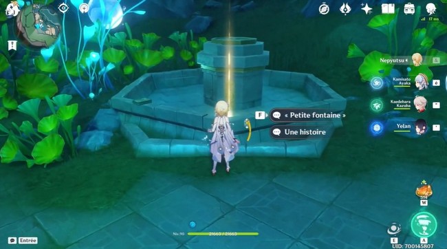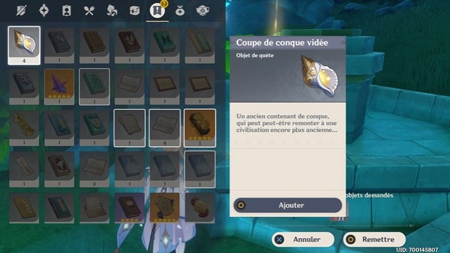 Choisissez « Petite Fontaine » et vous aurez l’option de (Offrir la coupe de conque vidée) pour que les objets de la quête soient convertis en matériaux de raffinement ‘Calice sacré déferlant’.