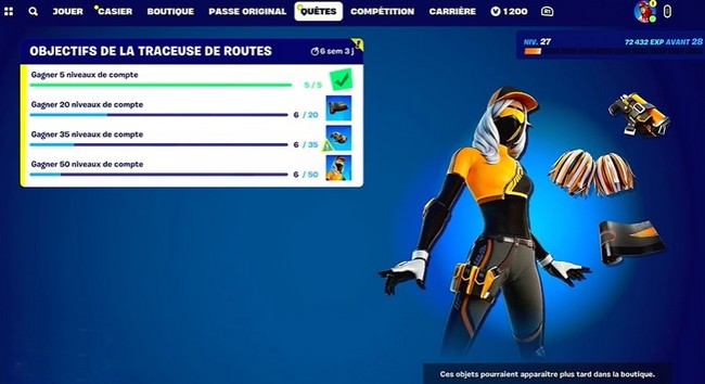 Tout ce que vous avez à faire pour obtenir les récompenses ci-dessus est de gagner des niveaux de compte, ce qui signifie simplement que vous devez augmenter le niveau de votre compte en gagnant de l’XP. Tant que vous continuez à monter en niveau, votre progression sera suivie sur l’écran Objectifs Traceuse de Routes dans l’onglet Quêtes du jeu.