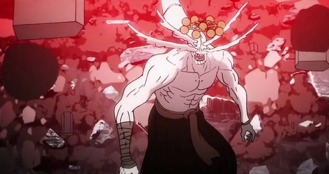 Dans le présent, après avoir été invoqué, Mahoraga tue Megumi, qui reste dans un état de mort suspendue. Sukuna sent que Megumi est en danger et vient le sauver, comprenant rapidement que le pouvoir de Mahoraga est de s’adapter à n’importe quelle attaque. Sukuna déclenche un Domain qui s’arrête juste devant l’endroit où se trouve Megumi et exorcise Mahoraga.