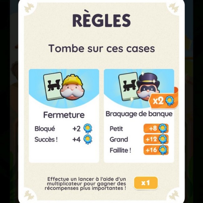 Lorsque vous atterrissez sur l’une des 4 gares : Gare Saint-Lazare, Gare du Nord, Gare de Lyon ou Gare Montparnasse, vous pouvez déclencher le braquage de la banque. Ce sont des cases jaunes avec un train.
