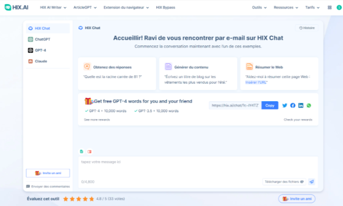 HIX AI Chat propose les modèles GPT-3 et GPT-4 pour les réponses, ce qui en fait un assistant efficace. Il s’intègre également de manière transparente avec des navigateurs tels que Chrome et Edge, offrant une expérience utilisateur plus transparente.