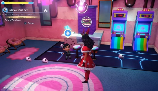 Après avoir placé tous les meubles dans un biome, placez la bannière et prenez une photo avec. Parlez ensuite à Jack et retrouvez Vanellope dans sa maison dans la vallée. Chez elle, vous devrez retirer les crânes en bonbons.