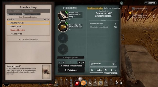 Vous débloquerez naturellement des recettes de cuisine plus variées lorsque vous commencerez à collecter des ingrédients. Nous vous conseillons de fabriquer en priorité un couteau de chasse et une faux. Le couteau de chasse augmentera le rendement de la récolte de matériaux sur les animaux, et la faux augmentera également le rendement de la flore récoltée.