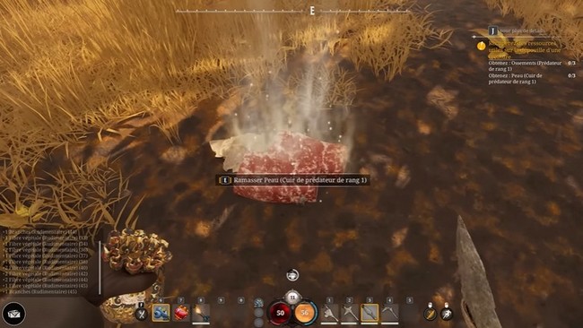 Lorsque vous voyez cette icône, utilisez votre couteau en cliquant avec le bouton gauche de la souris pour extraire les ressources. En effectuant cette action deux ou trois fois, vous obtiendrez les ressources du prédateur, y compris les os et la peau, que vous pourrez ensuite collecter dans votre inventaire.