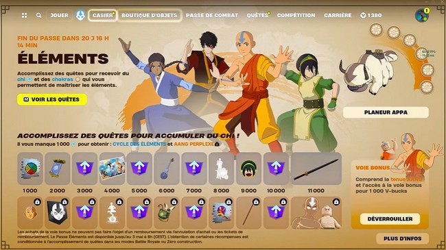 Les chakras font partie du passe d’événement Avatar. Ces jetons permettront aux joueurs de débloquer le planneur Appa. Vous devez en acquérir six pour recevoir l’objet cosmétique, mais ils sont directement associés aux quêtes inspirées d’Avatar.