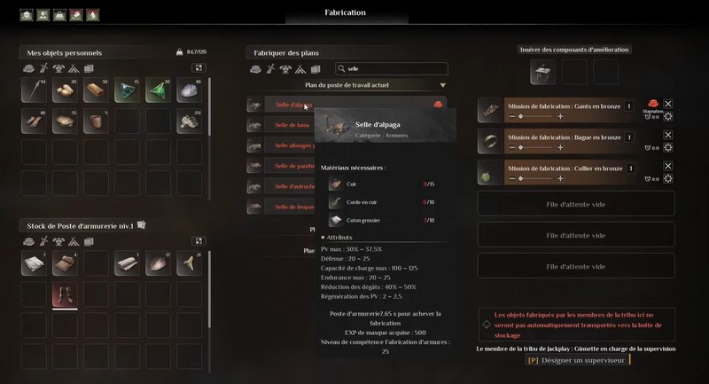- Fabriquez une selle d’alpaga en utilisant 10 cordes en cuir, 10 coton grossier et 15 cuir à la poste d’armurerie.