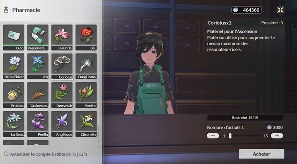 Dans « Wuthering Waves », les joueurs ont besoin de nombreuses spécialités locales pour faire évoluer leurs personnages. Il est donc utile d’acheter des matériaux supplémentaires. À la Pharmacie de Jinzhou, les Résonateurs peuvent acheter du Coriolus auprès de Koko. Chaque Coriolus coûte 3 000 crédits coquilles chacune. Pour acheter les 15 ressources disponibles, il faut débourser 45 000 crédits coquillages. La Pharmacie réapprovisionne ses produits tous les quelques jours, permettant aux joueurs de se réapprovisionner régulièrement.