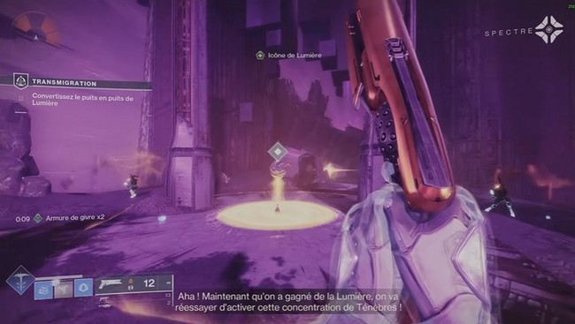 Une fois la mission commencée, vous vous retrouverez dans un espace d’un autre monde, rempli de teintes violettes et de nouvelles menaces. Suivez le marqueur de quête et vous trouverez un puits. Approchez-vous de lui et il se transformera en orbe de ténèbres. En tirant dessus, vous pourrez avancer, mais vous devrez éliminer une vague d’ennemis pour obtenir une icône de lumière. Ramassez-la et vous serez accueilli par d’autres ennemis.