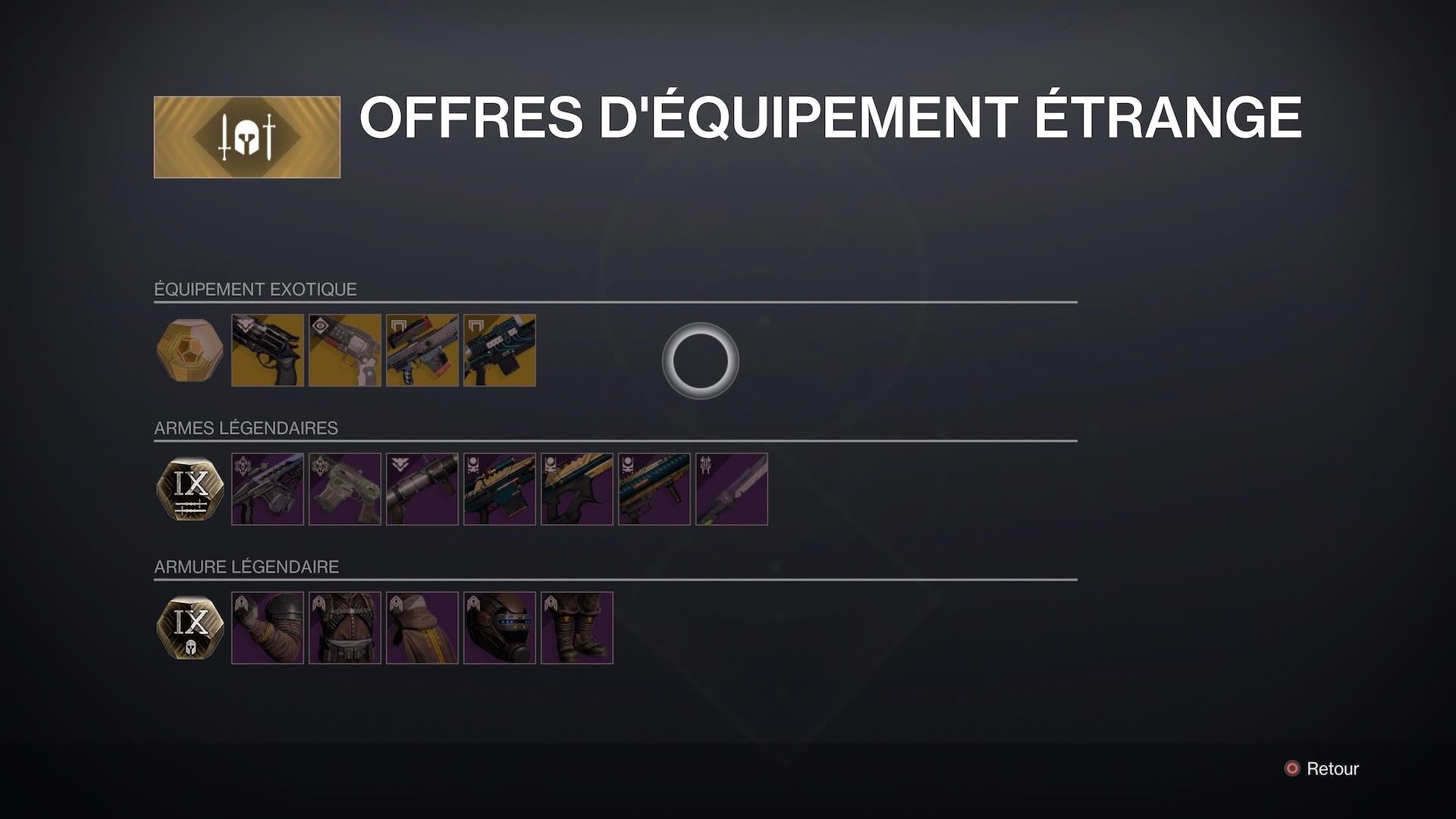 Xur mettra en vente cette semaine une autre arme exotique, trois pièces d’armure exotiques, un engramme exotique, sept armes légendaires et cinq pièces d’armure légendaires.