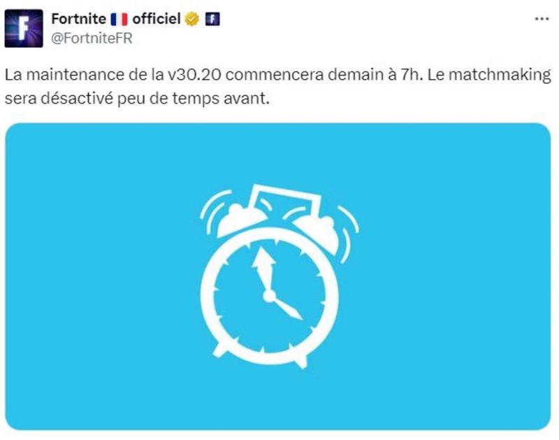 Selon Epic Games, « le temps d’arrêt de la v30.20 commence à 7 heure du matin, heure de Paris, et le matchmaking se termine peu avant ». Des ajustements ont été apportés aux horaires des tournois en raison de cette maintenance, avec des modifications pour les Coupes classées OCE et Asie ainsi que pour la Coupe classée Solo Zero Build. L’heure de début du OCE FNCS Major 3 Open Qualifier 2 sera retardée d’une heure.