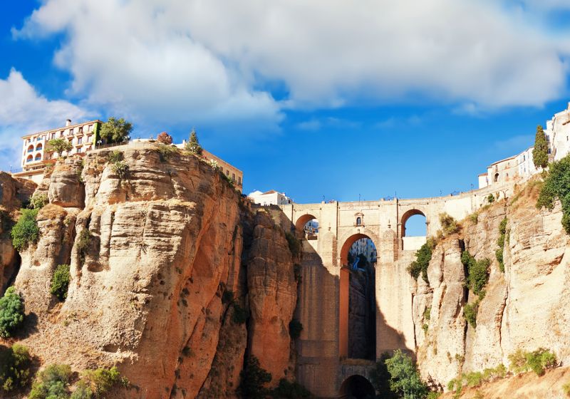 La ville de Ronda, perchée au sommet d’un massif rocheux dans la province de Málaga en Andalousie, bénéficie de vues spectaculaires sur les paysages environnants. Le pont « Puente Nuevo », qui traverse une gorge de 120 mètres de profondeur, est un point d’intérêt notable à Ronda grâce à sa construction au XVIIIe siècle. Sa Plaza de Toros, une des plus anciennes arènes d’Espagne, est également connue dans la ville. Ronda offre un mélange irrésistible de culture, d’histoire et de nature.