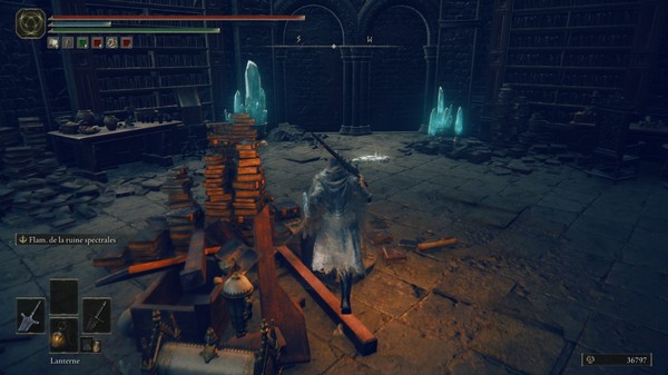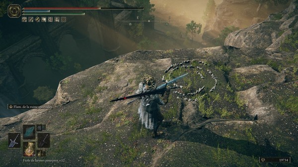 Au sud des Ruines antiques occidentales de Rauh, vous avez peut-être découvert une source spirituelle scellée. Cette source permet de rejoindre la ruine située à l’est. Pour la débloquer, vous devez trouver le tas de pierres situé au-dessus du courant ascendant bloqué. Dirigez-vous vers les ruines en face du site de grâce « Ruines antiques occidentales de Rauh », prenez la sortie nord en direction des ruines de la putréfaction écarlate, utilisez l’ascenseur de ces ruines, puis sortez par la sortie sud-est sans monter les escaliers. Ensuite, allez vers le bord de la falaise au nord-est pour trouver et détruire le tas de pierres bloquant le courant ascendant.