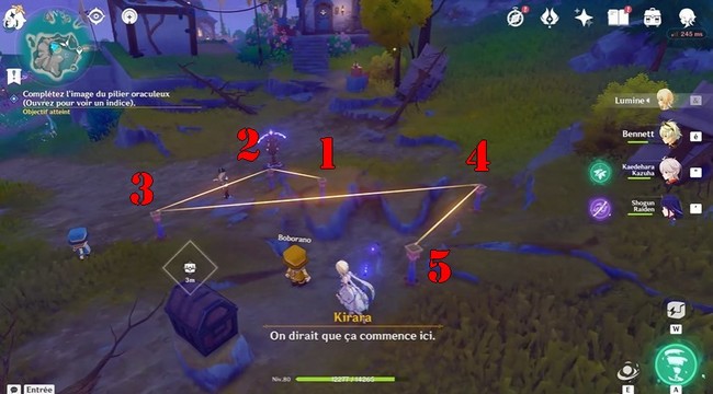 Approchez le pilier oraculeux 1 et reliez-le aux piliers 2, 3, 4 et 5 à l’aide du fil magique. Vous obtiendrez un coffre délicat à Genshin Impact et un morceau d’histoire d’un passé lointain.